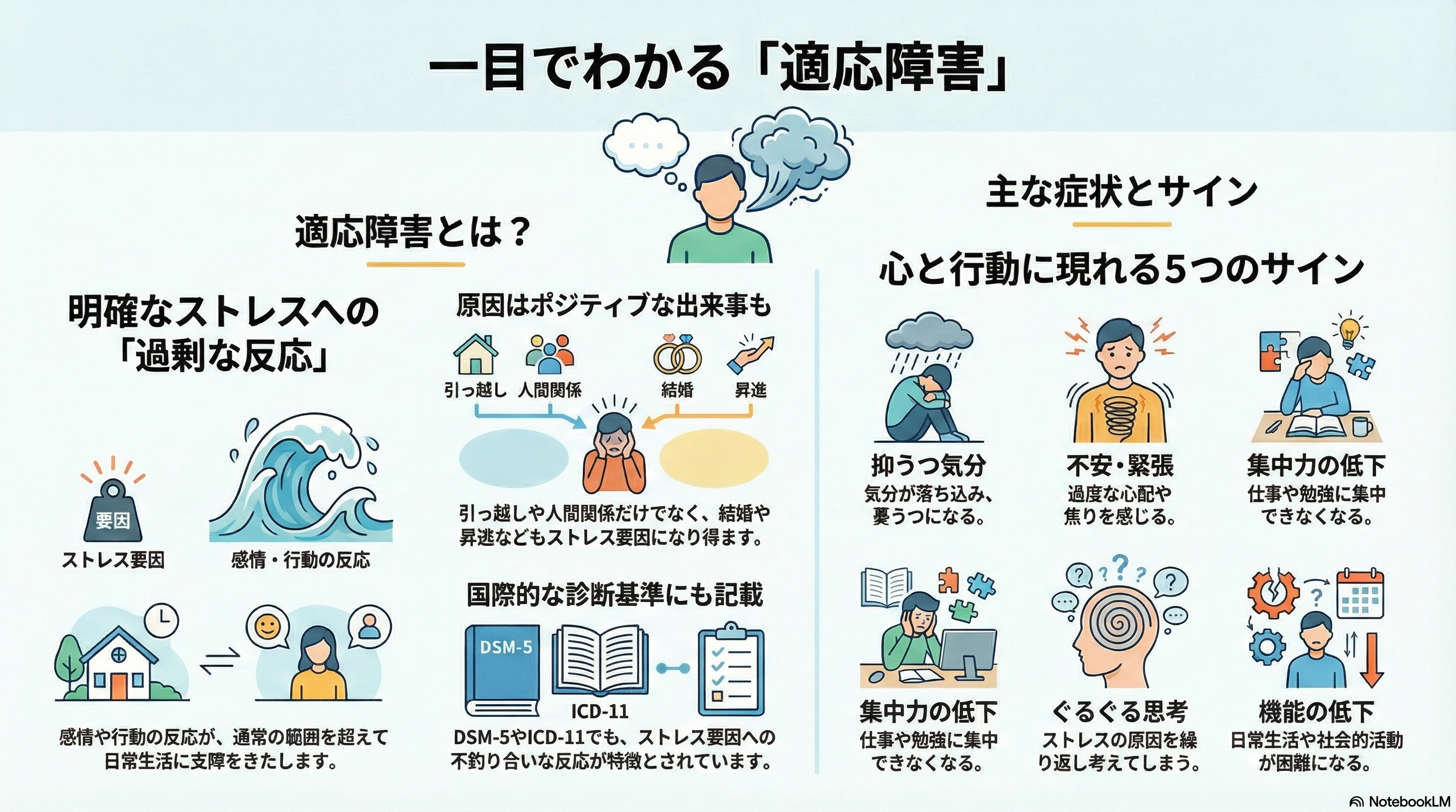 適応障害は、明確なストレス要因(心理的負担となる出来事)に対する反応が、本人の通常の反応よりも大きく、日常生活に支障をきたす状態として理解されます。