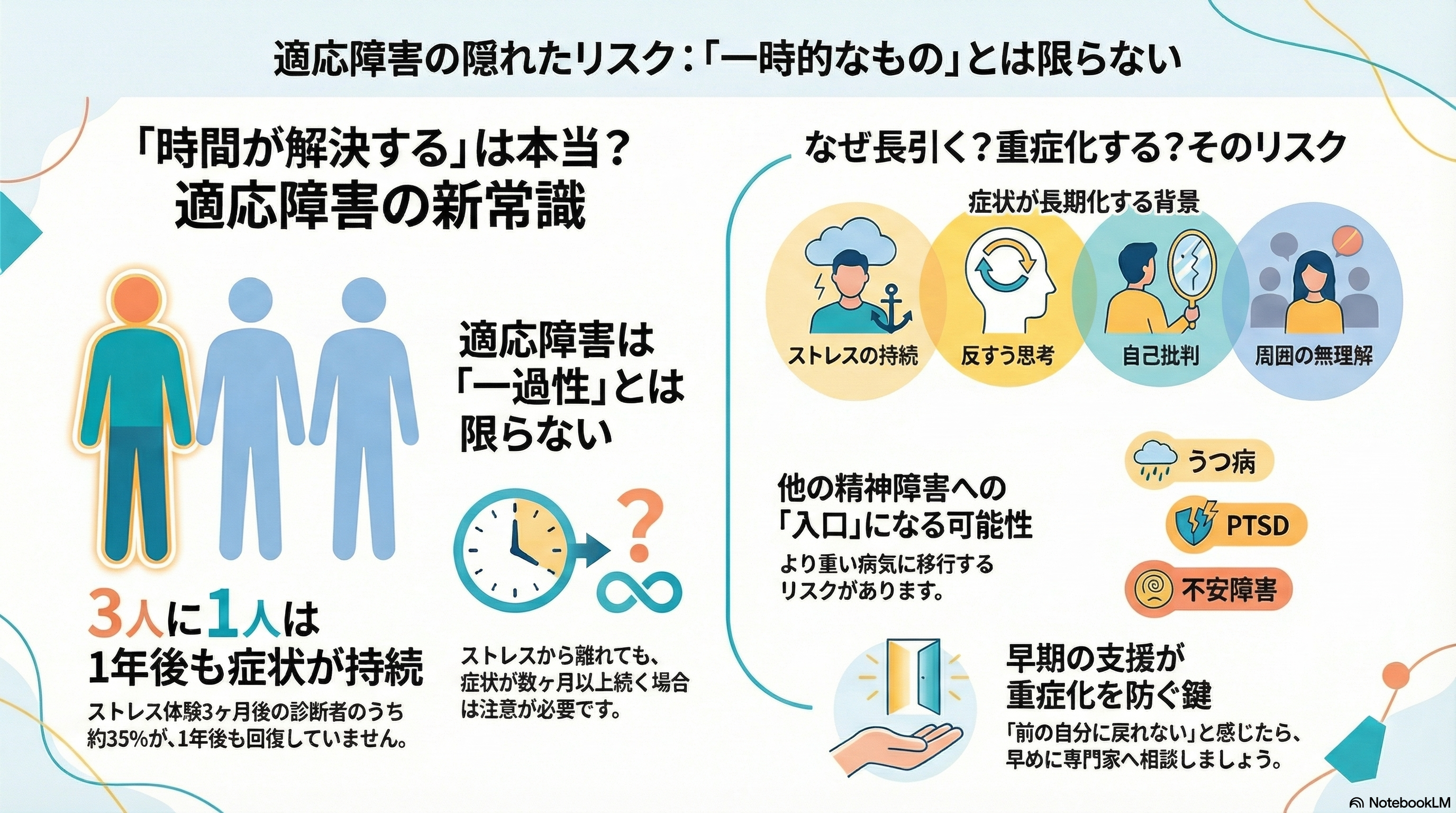 この結果は、適応障害を「時間が解決してくれる」「放っておいても自然に治るもの」と一括りにすることの危うさを示しています。