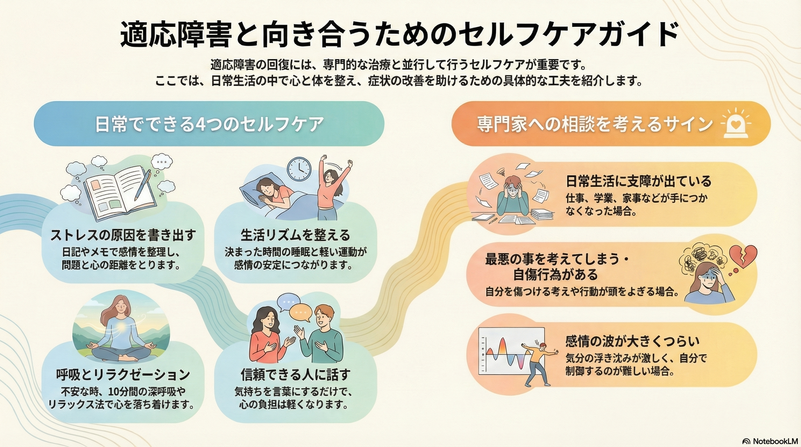 適応障害に対しては、専門的な治療を受けながら、日常的にできるセルフケアが症状の改善を助け、回復を早めることが期待できます。