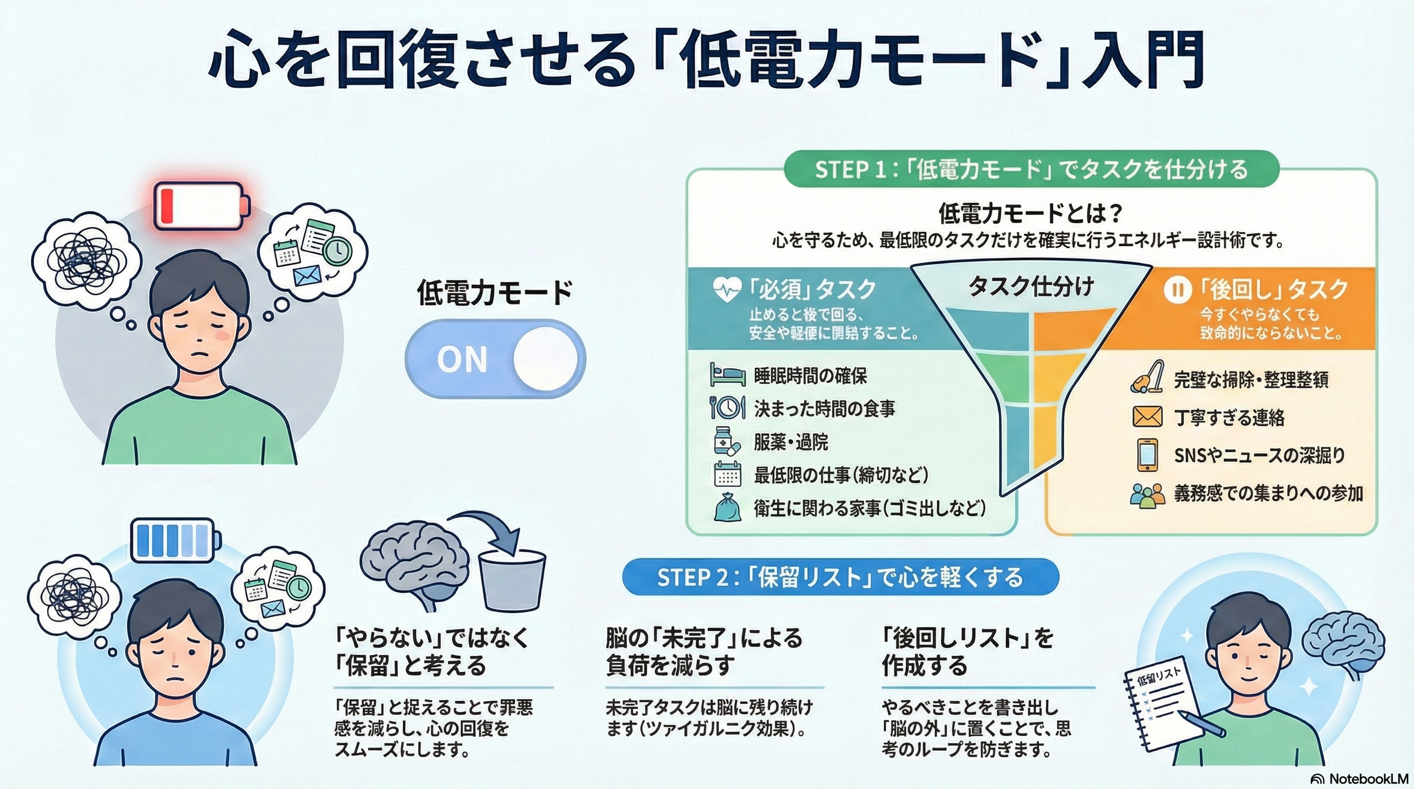 そこで、以下では「心の低電力モード」と後回しについて解説したいと思います。