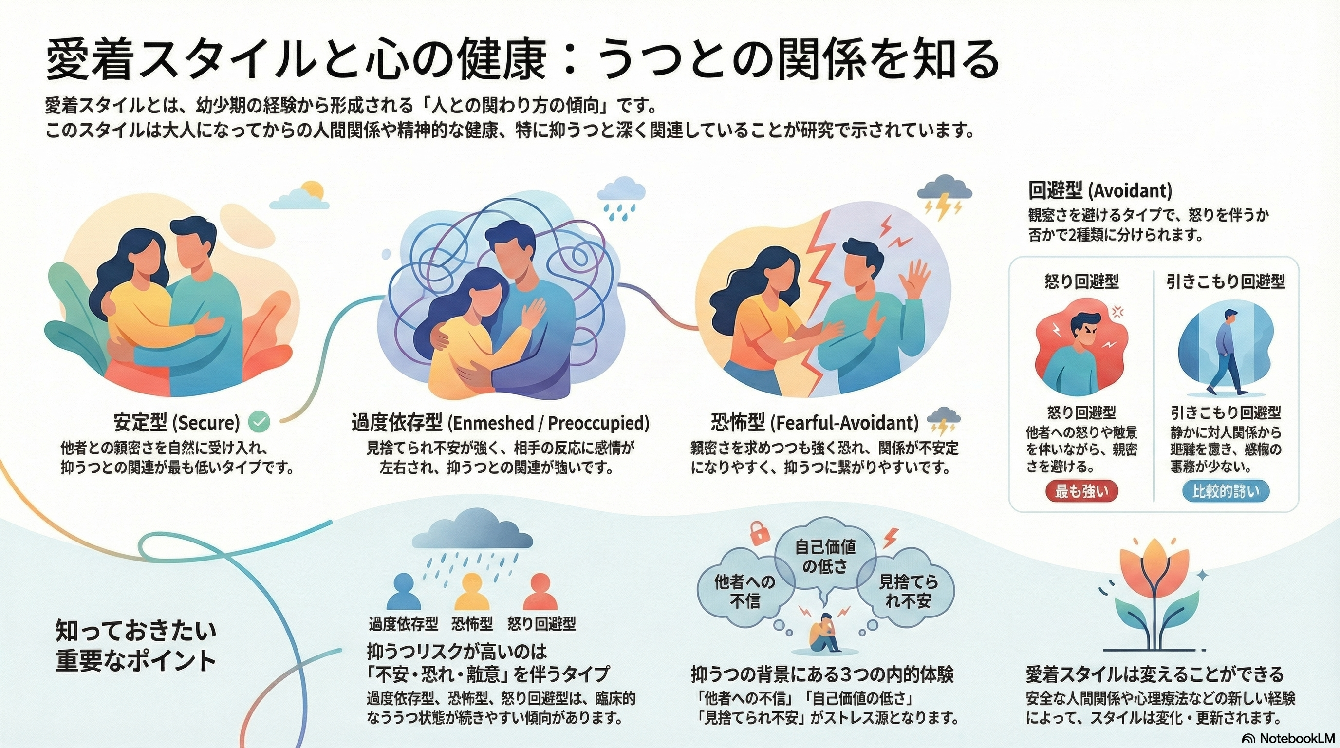 抑うつとの関連で注目する必要があるのは、過度依存型や恐怖型、そして怒り回避型といった、不安・恐れ・敵意を内包する愛着スタイルです。