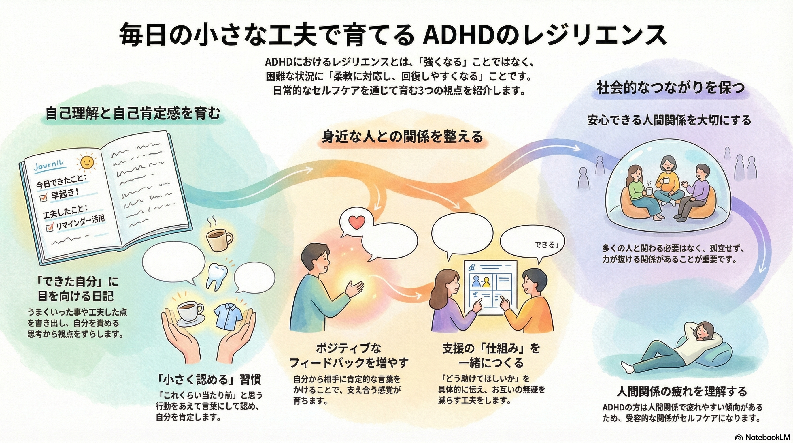ここまで、ADHDの方のレジリエンスの要素をご紹介してきましたが、ここから見えてくるのは、日常のセルフケアの積み重ねによってレジリエンスが育っていくというものです。