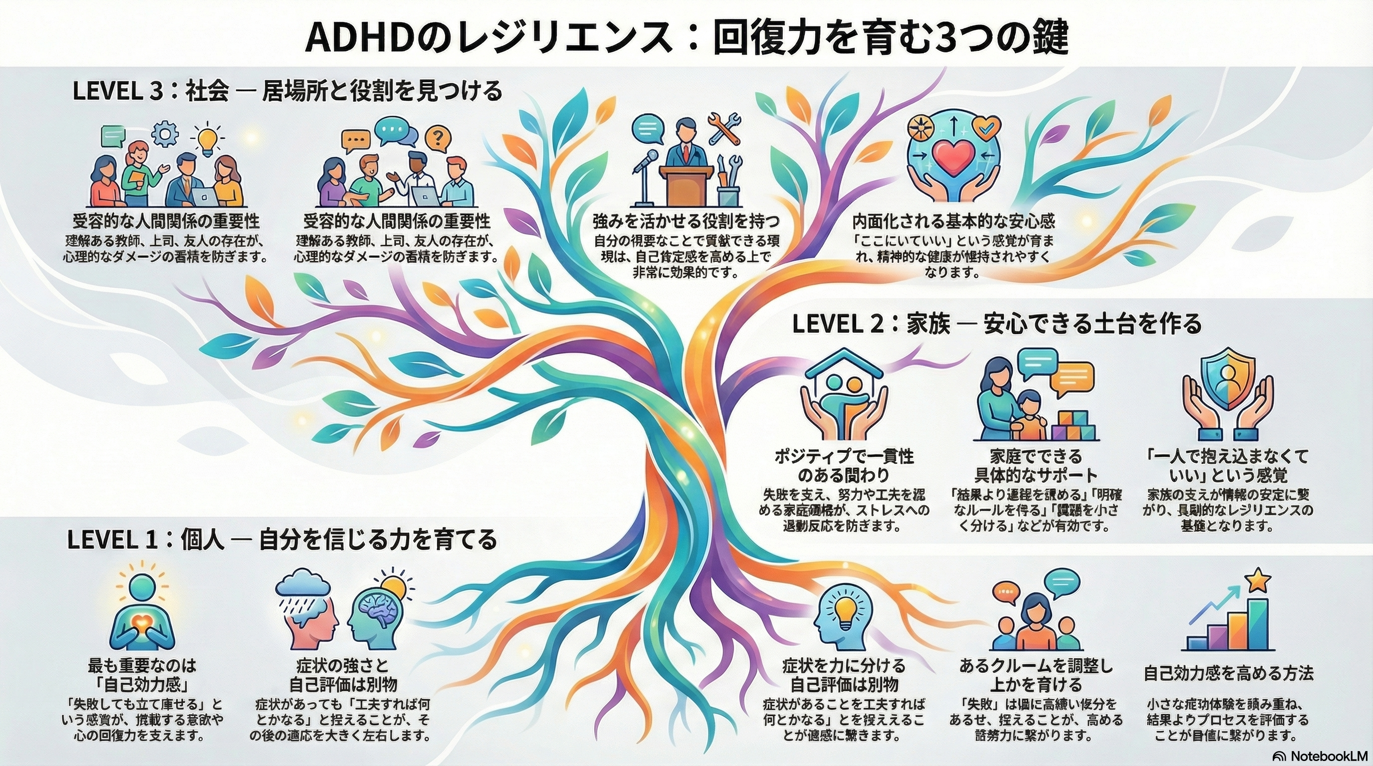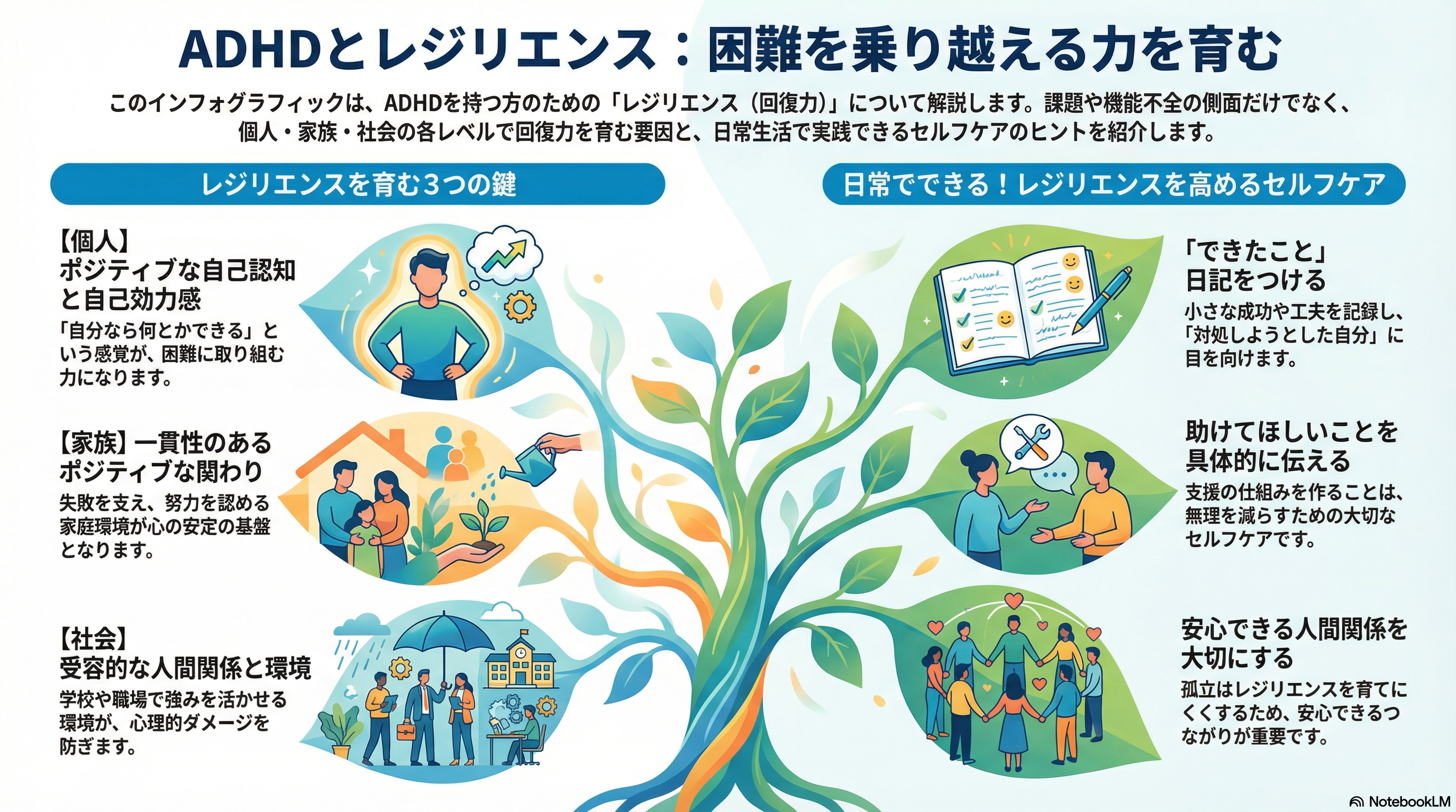 ADHDに関するレジリエンス研究でも、これらの因子が「個人・家族・社会(コミュニティ)」という複数の層で働くことが示されています。