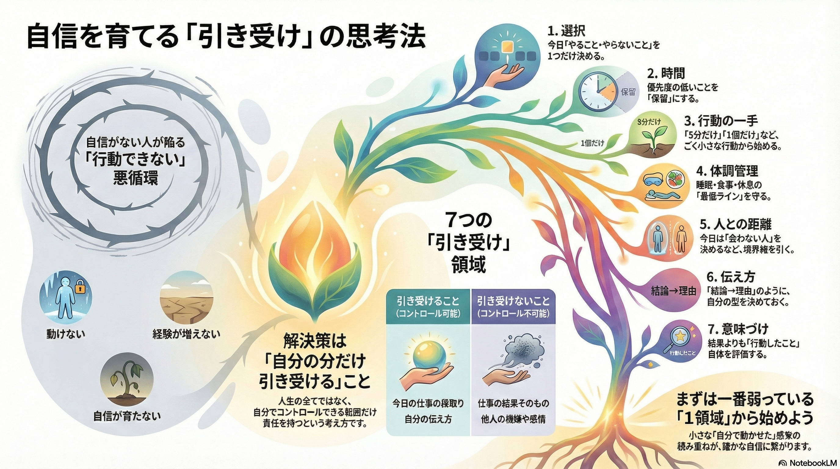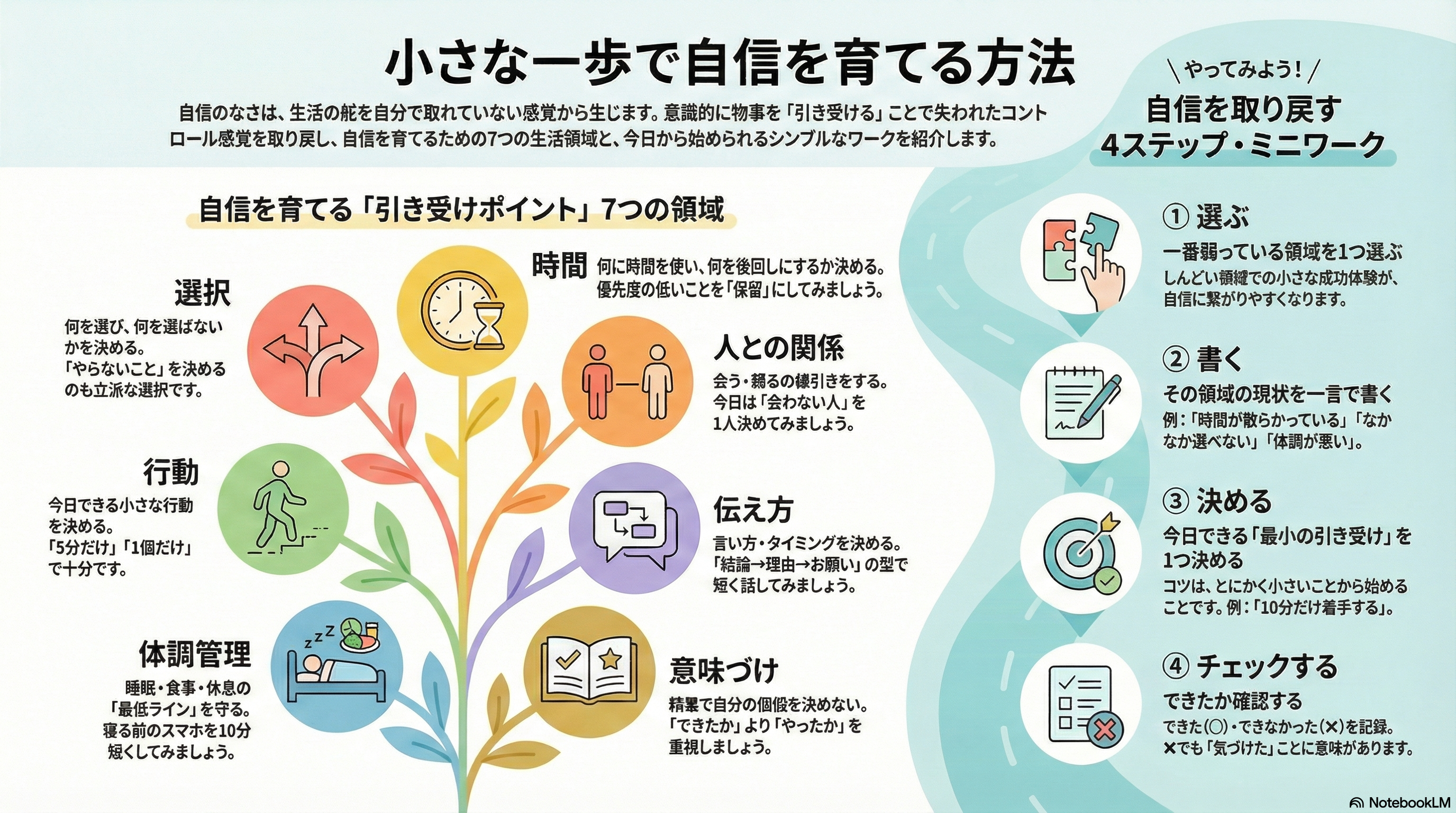 そして、次の7領域のうち、どれか1つでも「自分で決めた感覚」が戻ると、自信は育ちやすくなります。