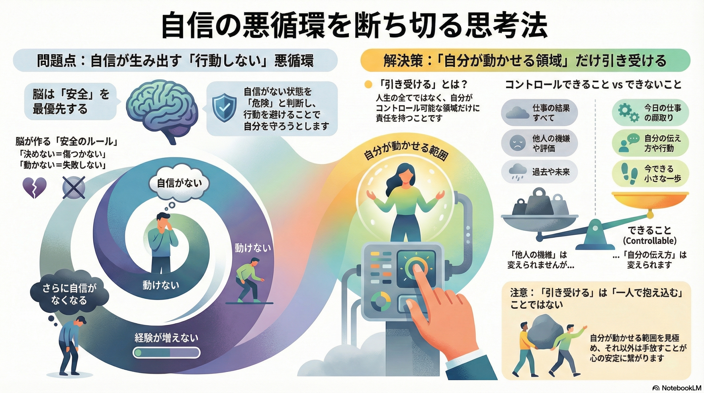つまり、自分が動かせる部分を見つけて、その範囲だけ引き受けるという積み重ねが、自信の土台になっていきます。