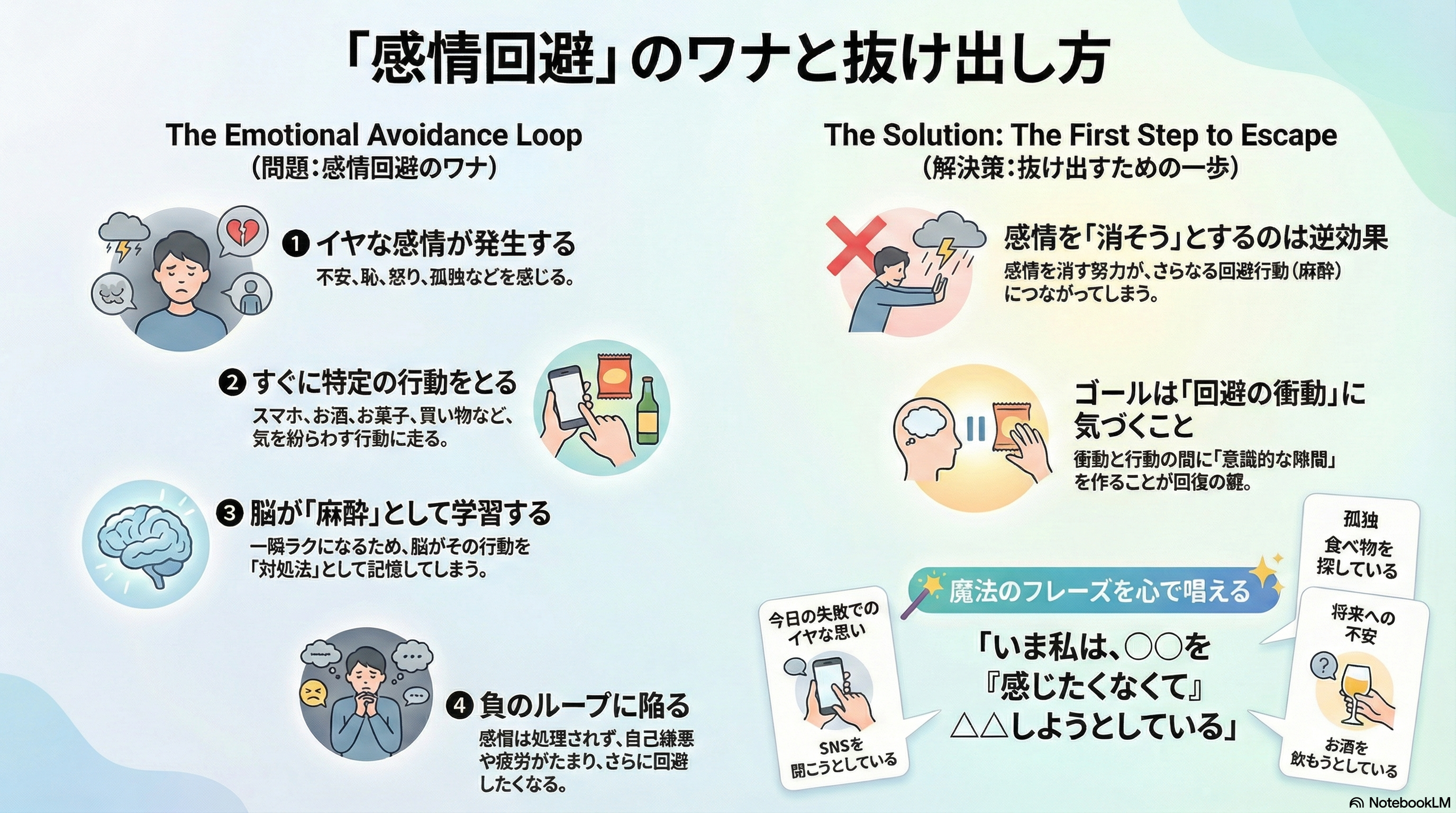 感情回避 → 一時的な麻酔効果→ 罪悪感・疲労 → さらに感情回避→再び麻酔が必要