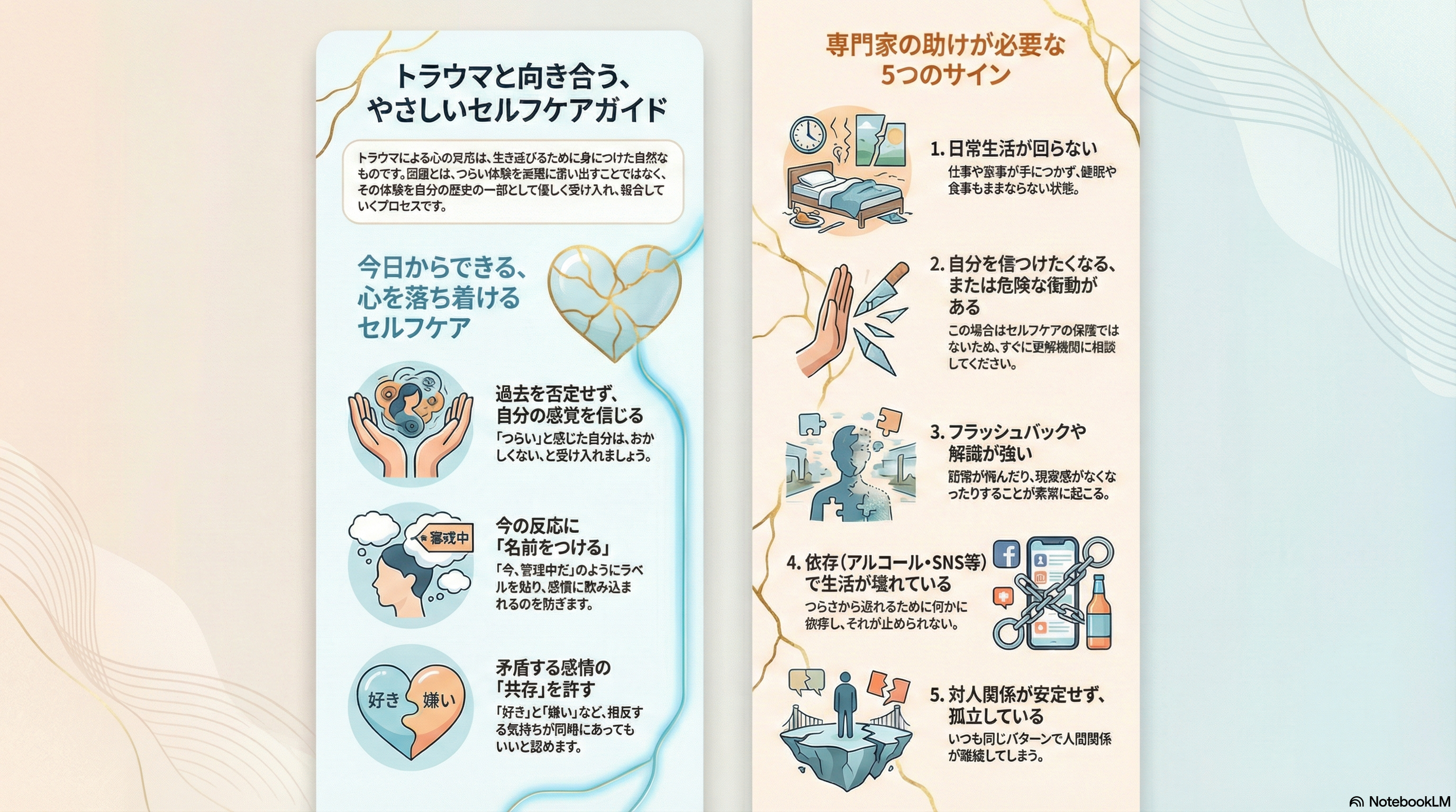 セルフケアはとても役立ちますが、トラウマの影響が強いときは、専門的な支援が必須となります。