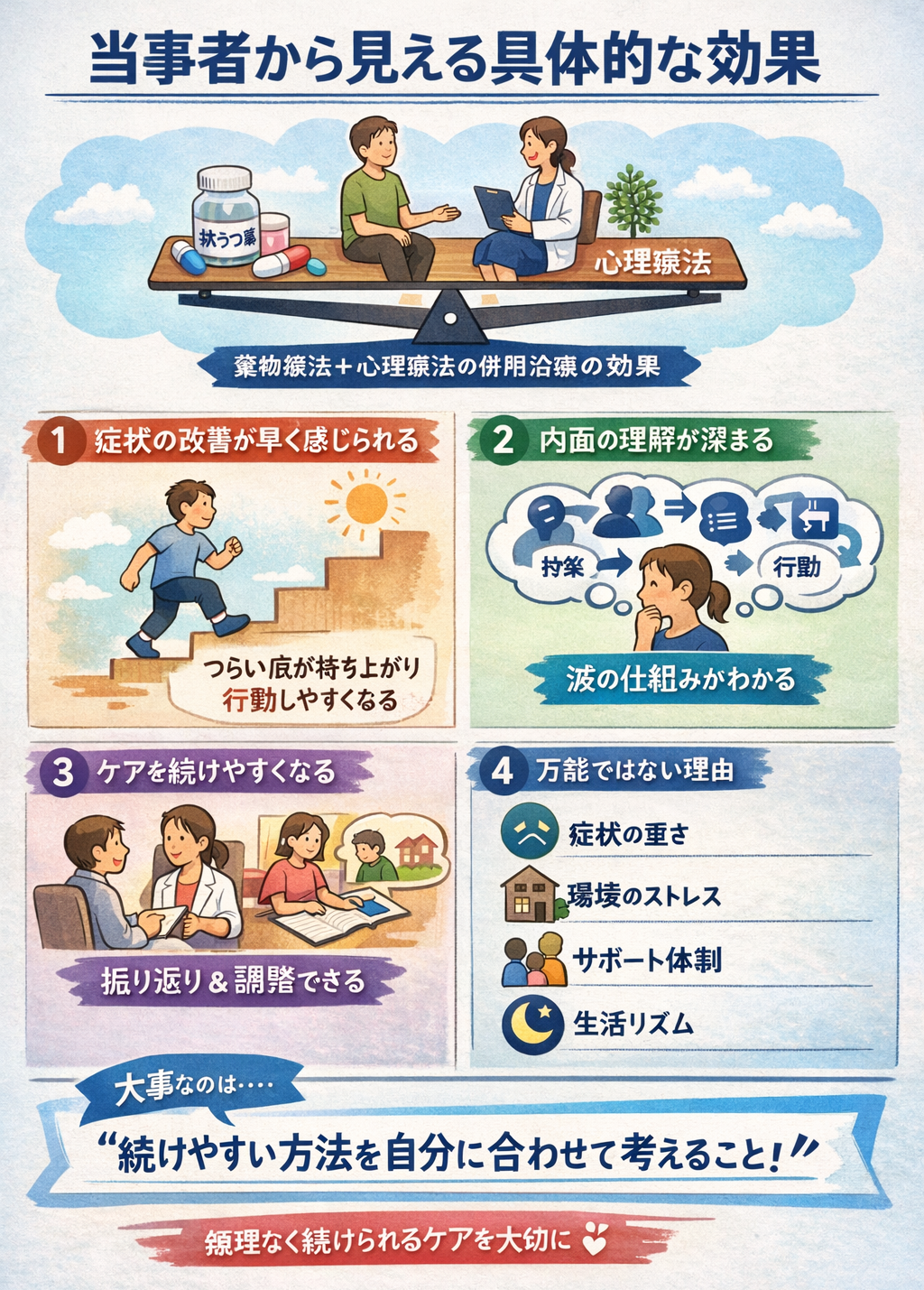この「理解できる=対処できる」という感覚が、次の「治療を続ける力」にもつながりやすくなっていくんですね。