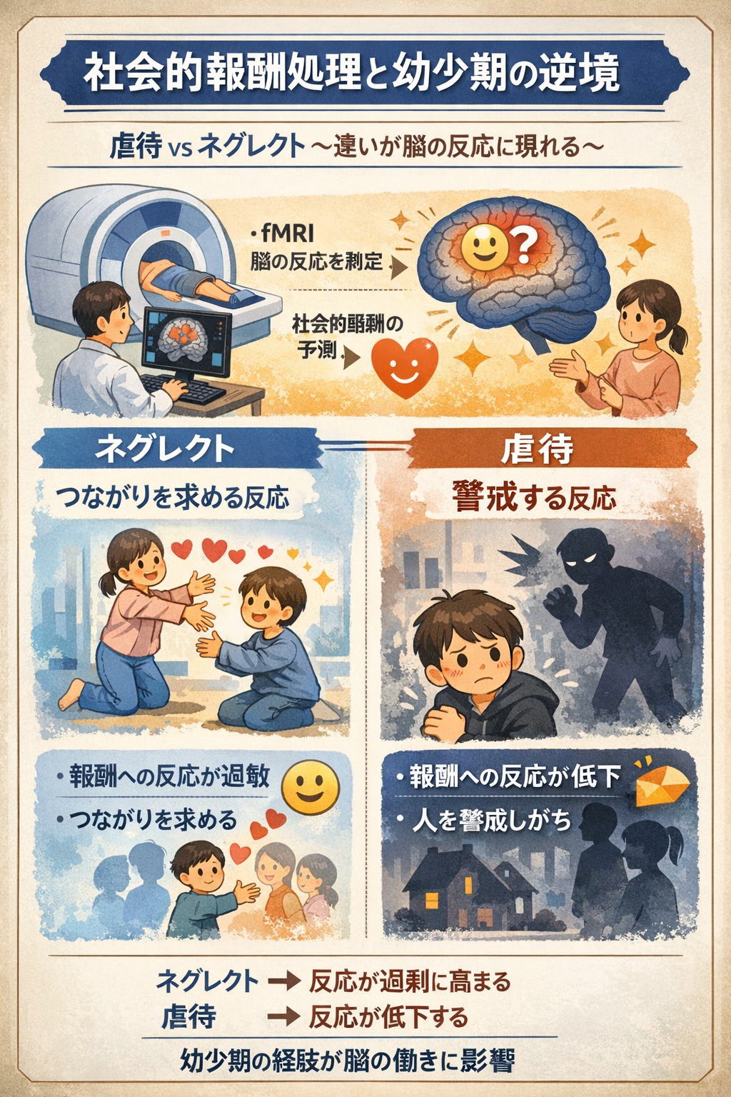 研究的にも、ネグレクトは社会的報酬に対する反応の偏り(敏感さ)が関連しうる、という示唆があり、「つながり」が当事者にとって重要なテーマになりやすいことと整合します。