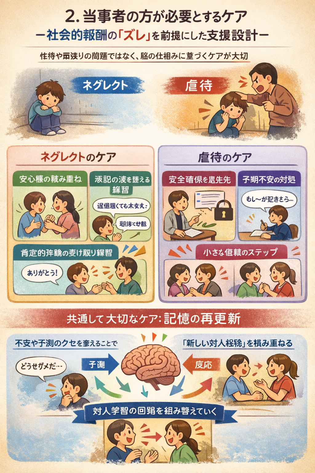 虐待・ネグレクトのどちらにも共通するのは、対人場面が「報酬」や「罰」として学習され、その学習が成人期まで持ち越されうる、という点です。