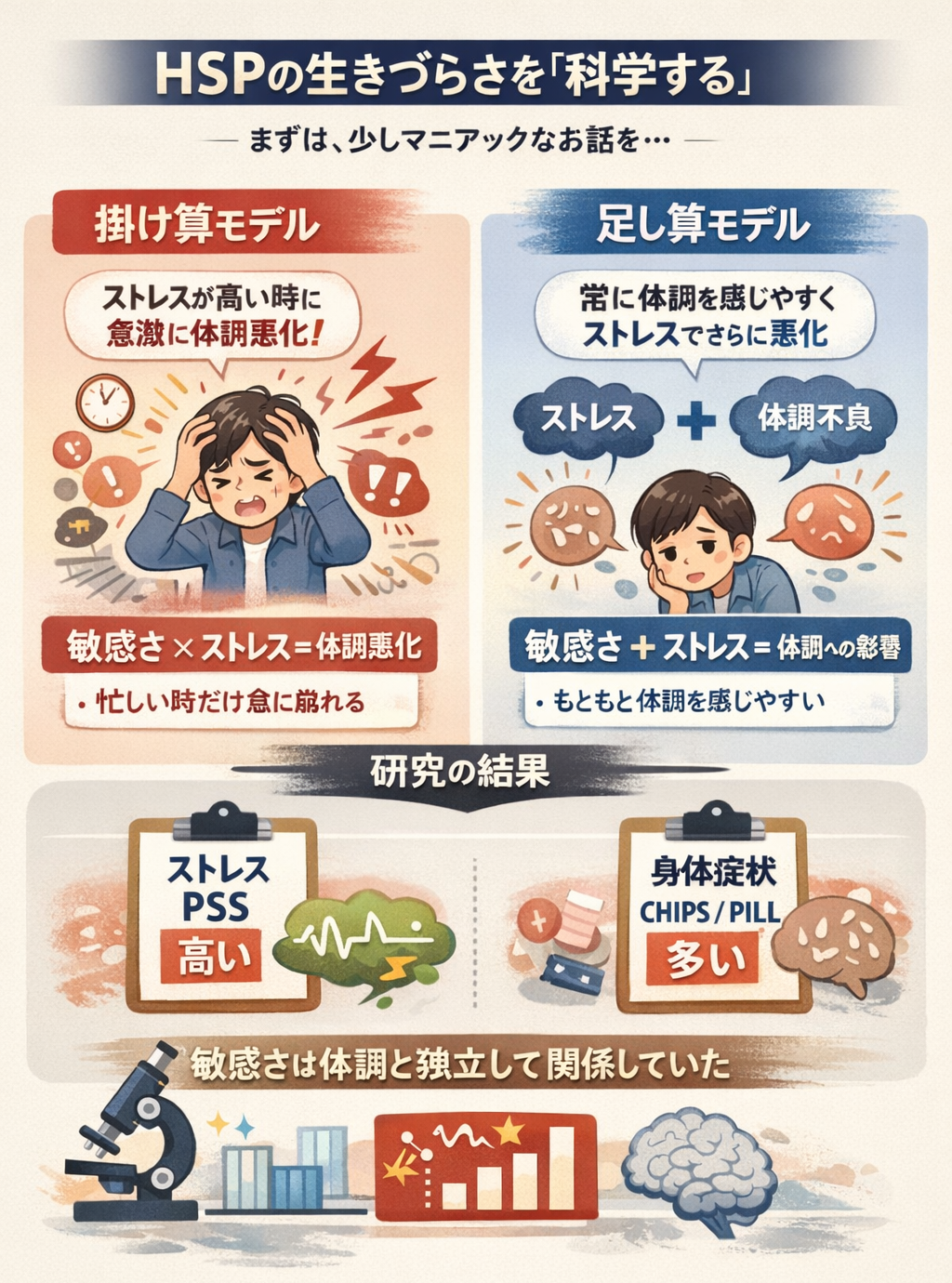 この研究で言っている「掛け算」と「足し算」は、HSP(敏感さ)とストレスが、体調にどう影響するかの違いを表しています。