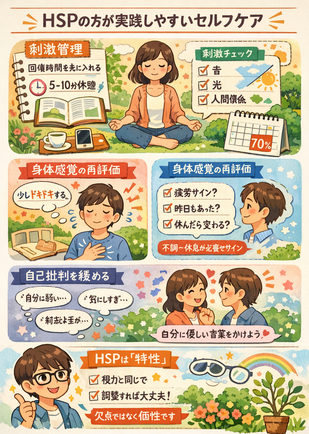 眼鏡をかける人が「視力が悪い自分は弱い」と責めないのと同じように、刺激に敏感な特性も「調整すべき条件」であって「否定すべき欠点」ではありません。