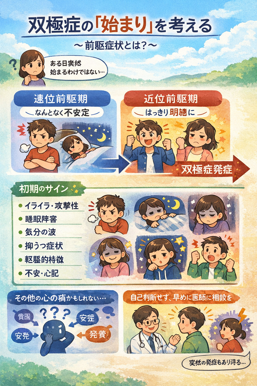 双極症は、ある日突然始まるわけではありません。