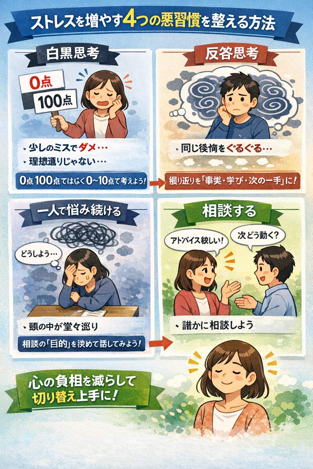 改善のポイントは、①自分を0点か100点で裁かず「できた点」と「次の工夫」を分けて見ること、②過去の後悔を反芻で終わらせず「次に何をするか」に変換すること、③一人で抱え込まず言葉にして整理することです。