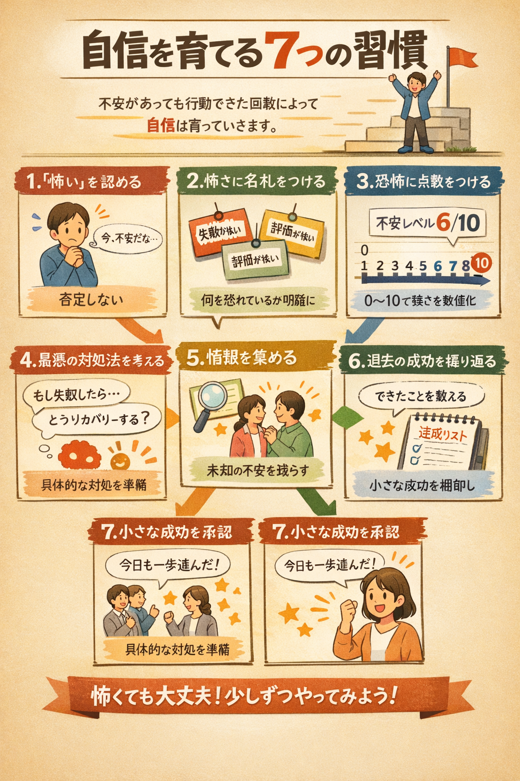 そこで、ここでは恐怖をなくすのではなく「扱える形」にして、行動と経験を積み上げ、自信を育てるための7つの習慣を具体的にお伝えしたいと思います。