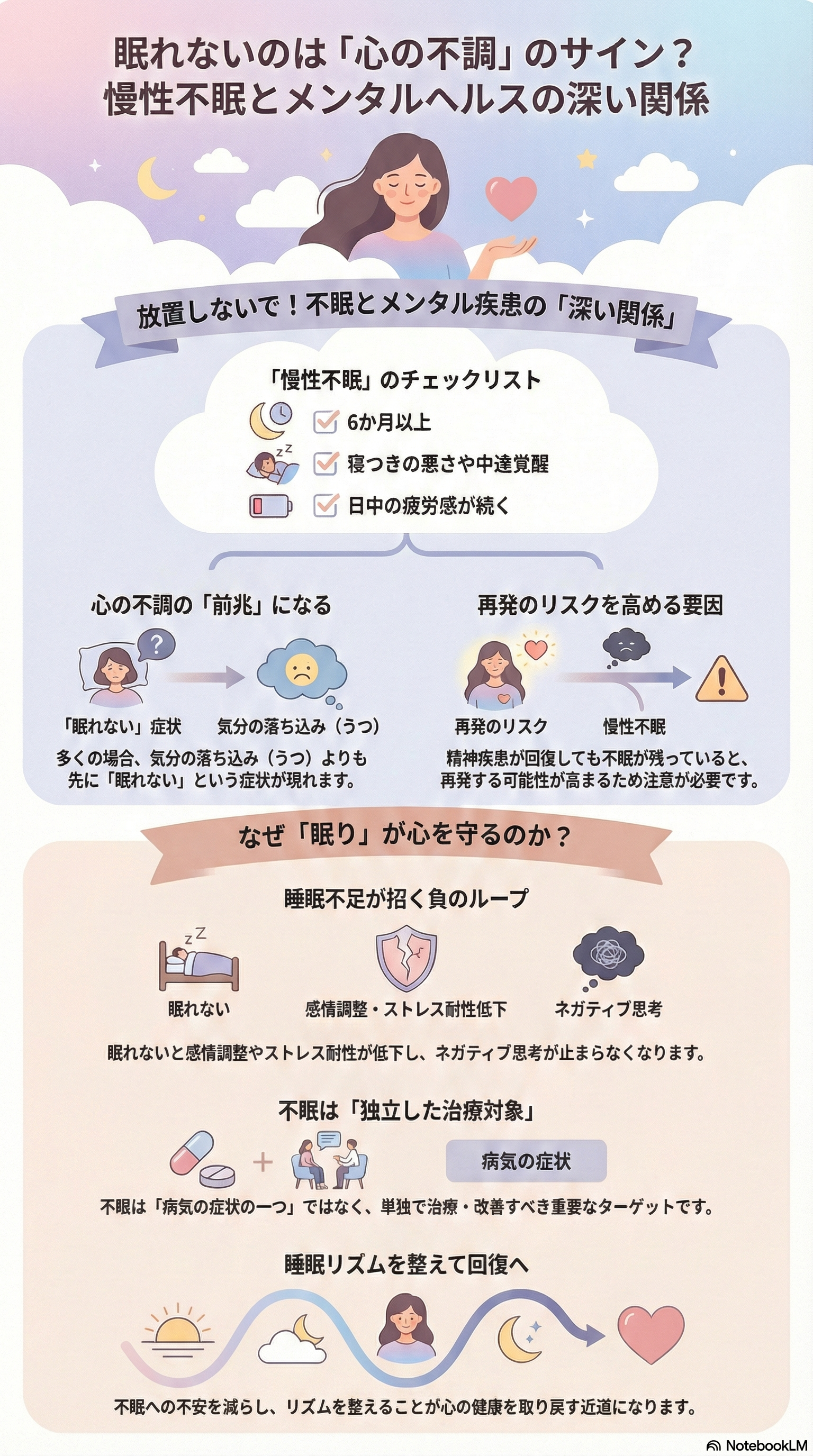つまり、不眠は単なる症状ではなく、精神的不調の前兆やリスク要因として機能する可能性が示唆されます。