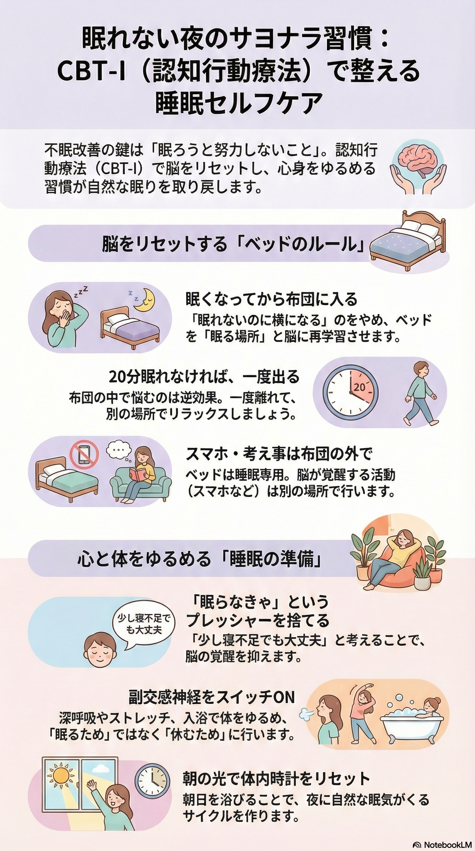 重要なのは、ベッドを「眠れる場所」という位置づけで脳の再学習を促すことです。