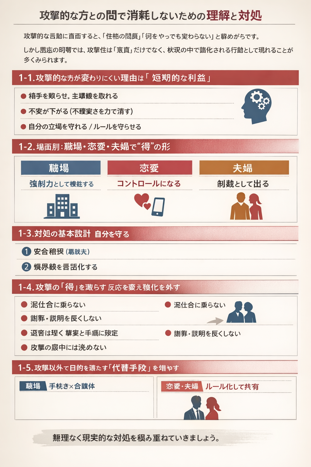そこでここでは、攻撃がなぜ続くのか(短期的な利益)を整理し、典型的な場面である職場・恋愛・夫婦での違いを踏まえたうえで、現実的に関係を動かす対処設計をまとめたいと思います。