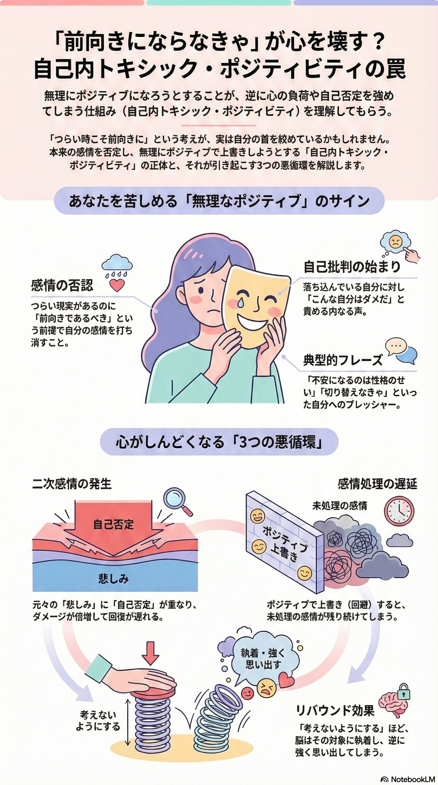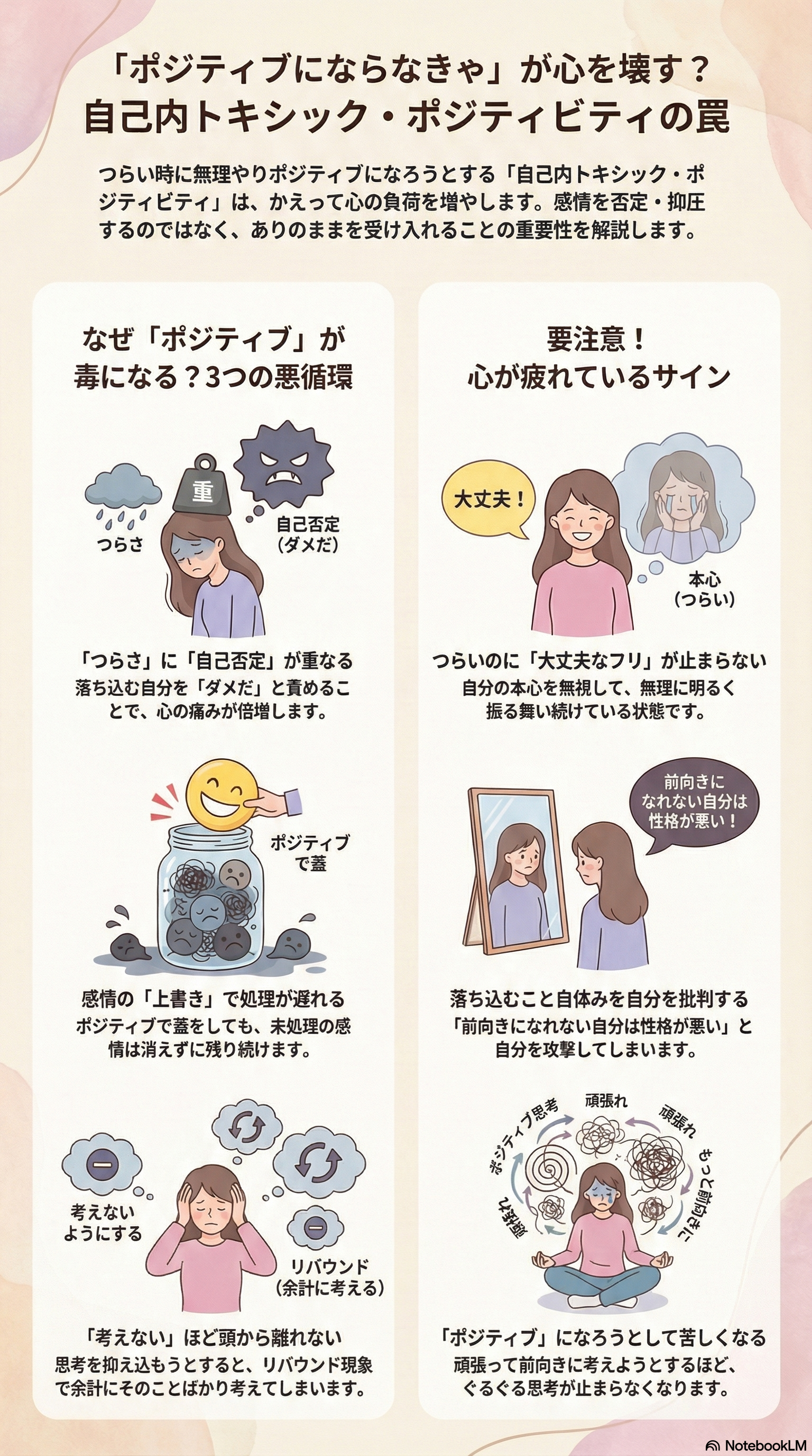 つらさを打ち消そうとする使い方(自己内トキシック・ポジティビティ)が心に負荷をかけている点にあります。