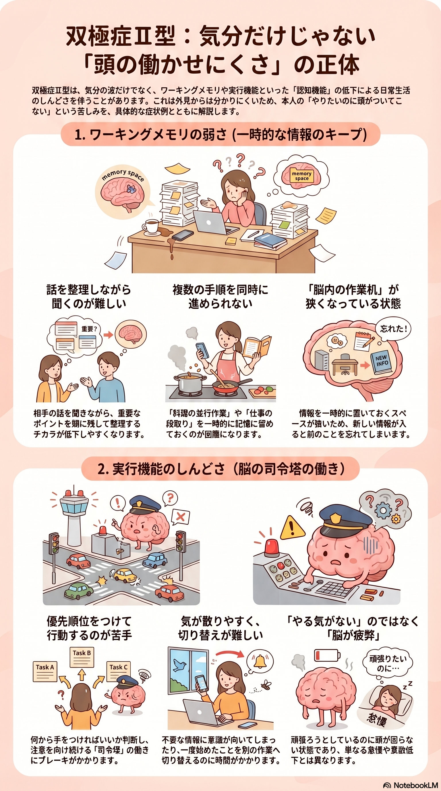 双極症(双極性障害)II型というと、気分の落ち込みや軽躁状態に注目が集まりやすいですが、実際には「考えがまとまりにくい」「覚えておきたいことが抜ける」「頭の切り替えがしづらい」といった困りごとが気になる方も少なくありません。