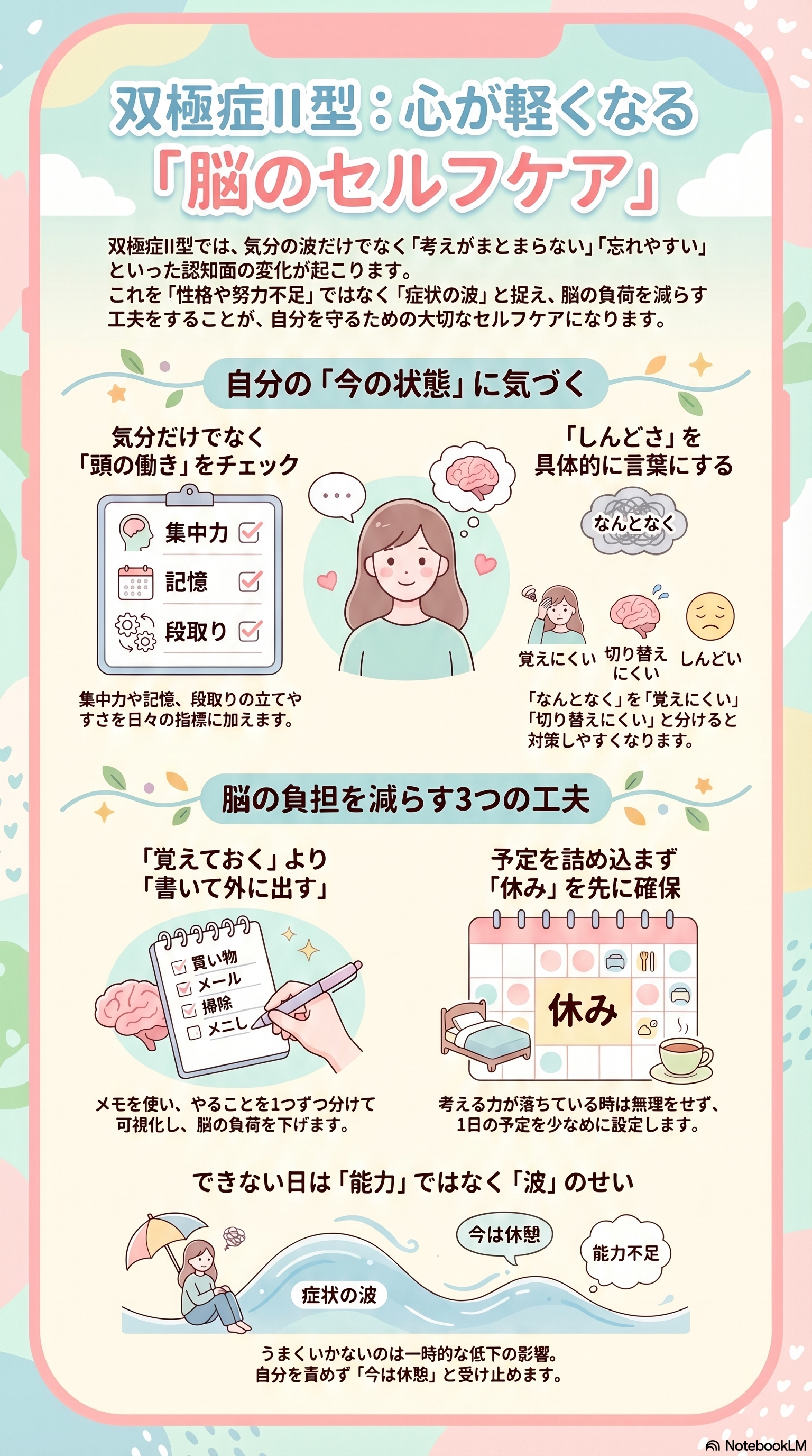 双極症II型のセルフケアでは、気分だけでなく、考える力、覚えるチカラ、段取りや切り替えのしやすさにも目を向けることが大切です。