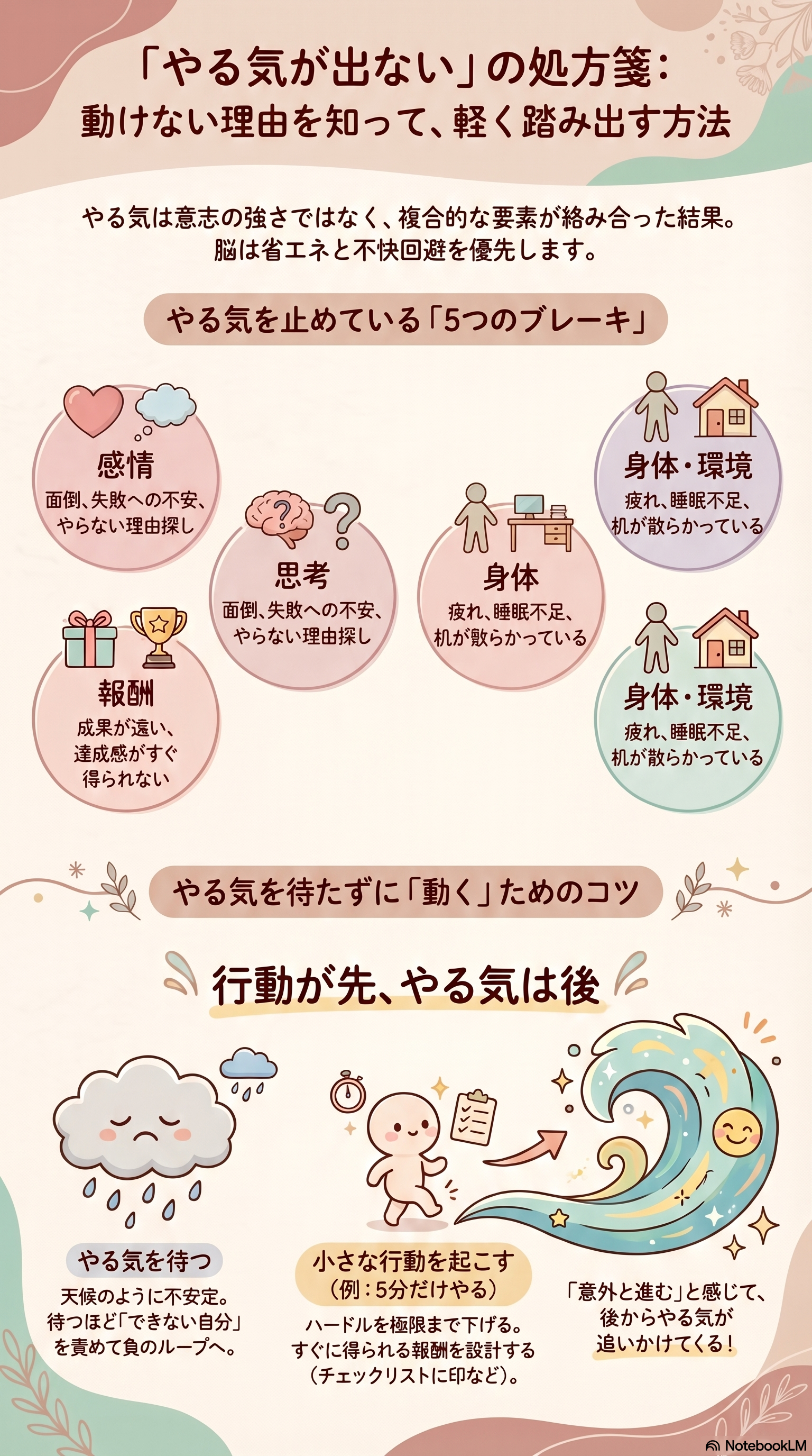 ここで重要となる視点は、「やる気が出ない=意志の弱さ」ではなく、「行動の開始を邪魔する要素が重なっている」と理解することです。